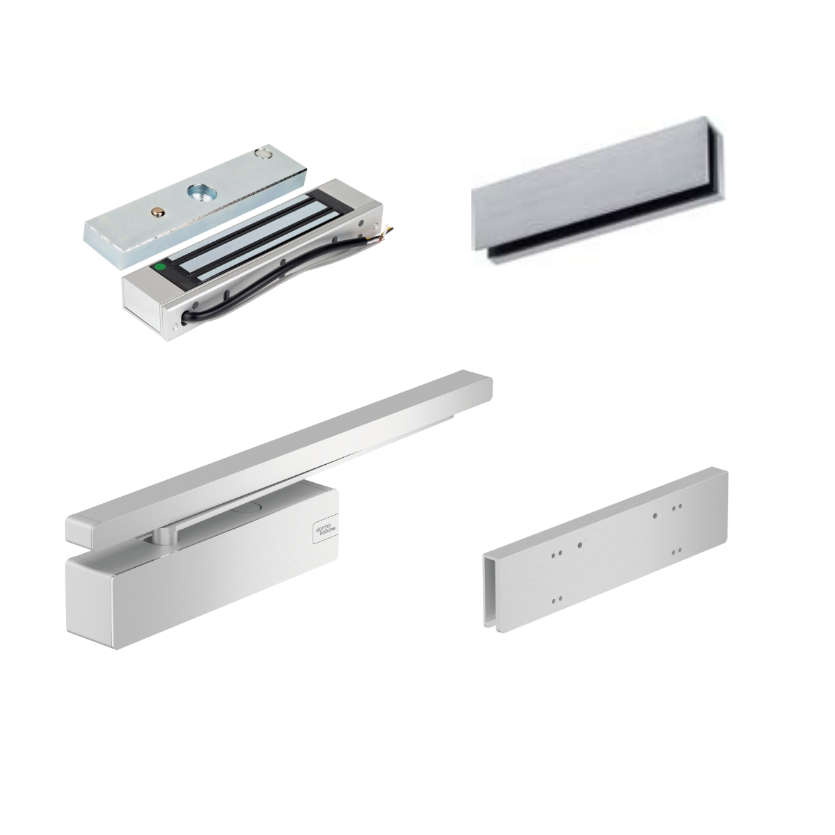 Комплект оборудования СКУД для цельностеклянных дверей включает в себя электромагнитный замок, дверной доводчик со скользящим каналом и монтажные пластины для установки