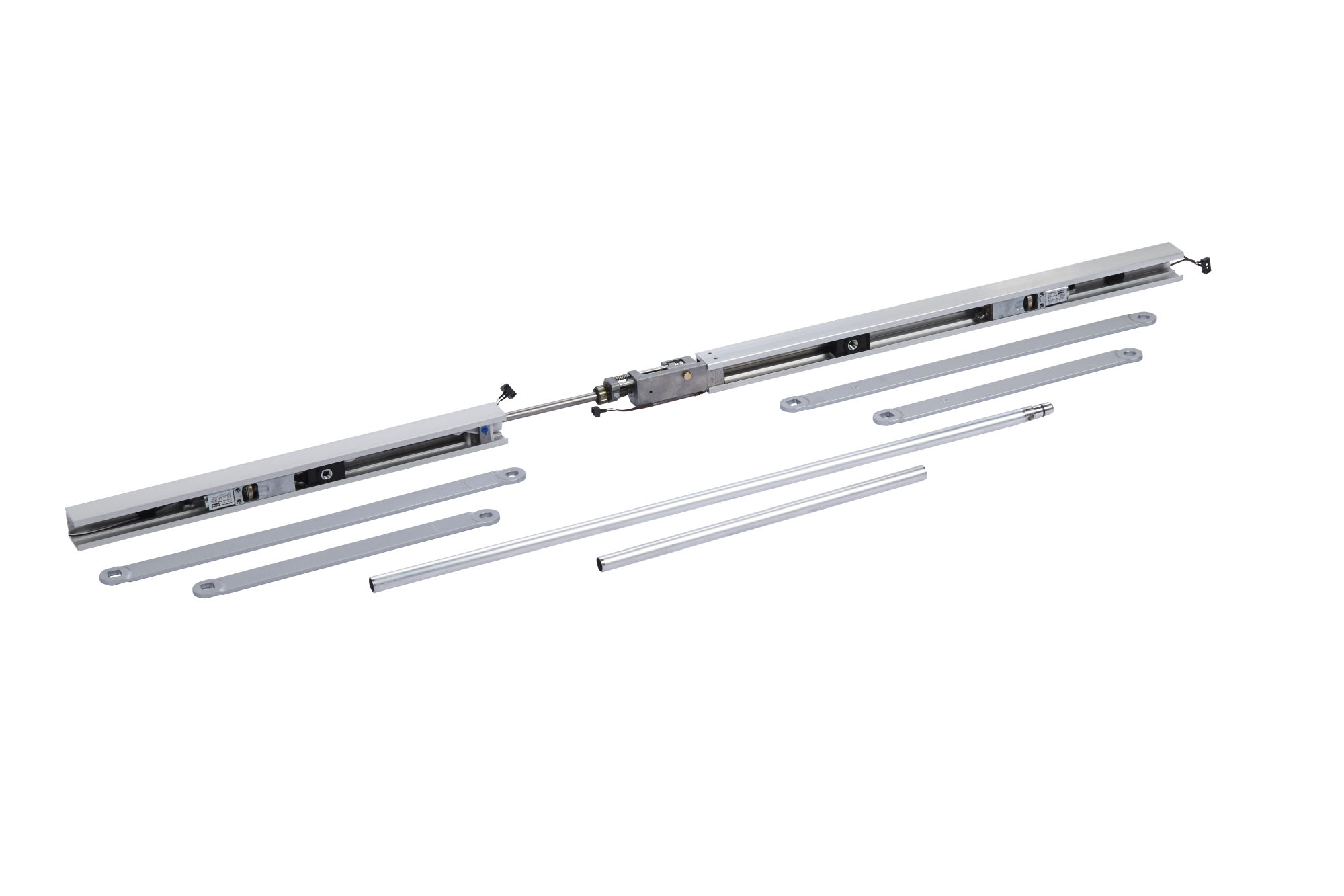 Координатор последовательности закрывания створок со скользящим каналом G 96 GSR –EMF состоит из cкользящих каналов для активной и пассивной створок с электромеханическим фиксатором, соединительной трубы, корпуса направляющей скользящей штанги со стопорной шайбой и пружиной и двух рычагов.