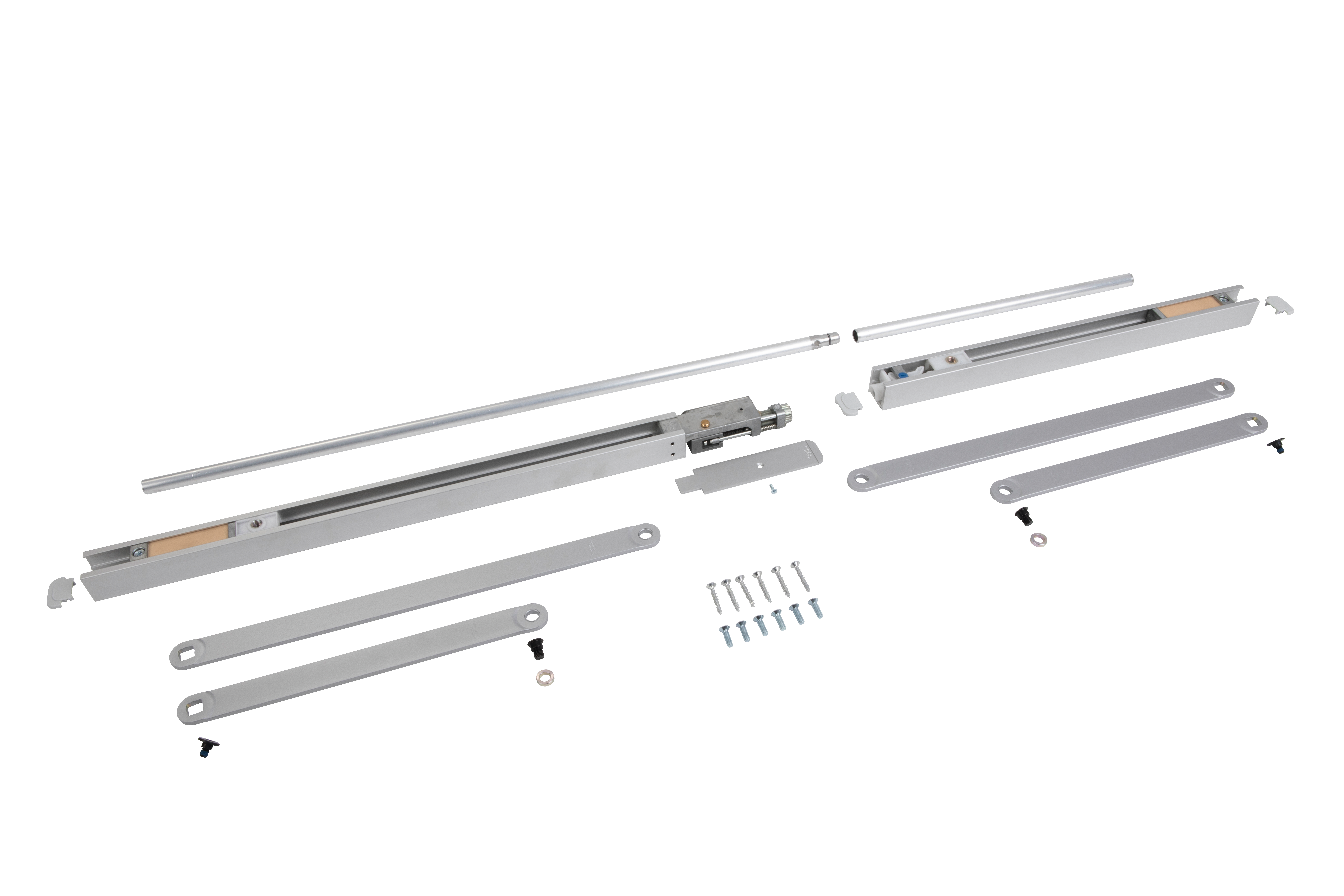 Координатор последовательности закрывания створок со скользящим каналом G 96 GSR состоит из скользящих каналов для активной и пассивной створок с ограничителем угла открывания, соединительной трубы, корпуса направляющей скользящей штанги со стопорной шайбой и пружиной скользящего канала и двух рычагов.