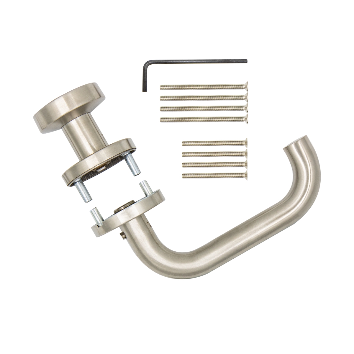 В комплекте: 2 нажимные ручки, цельный шток, крепежные винты для сплошных дверей