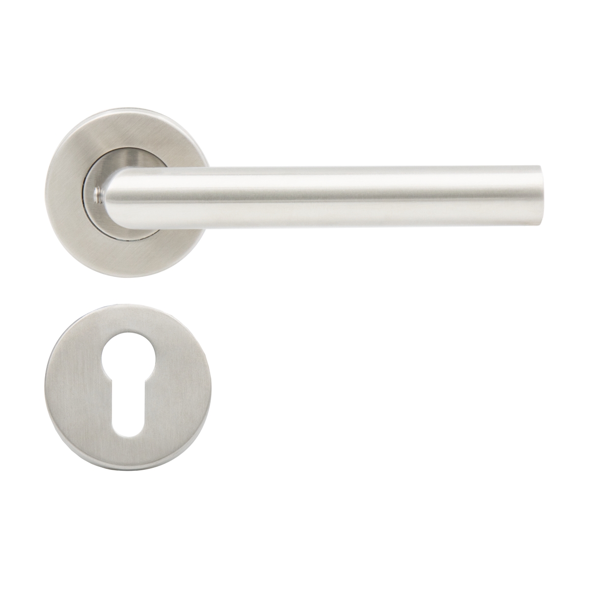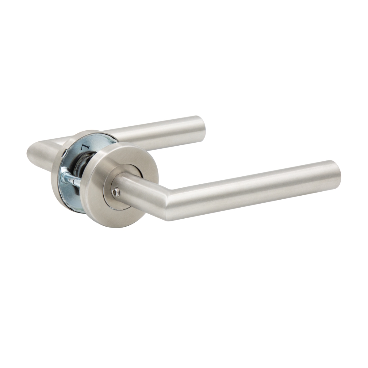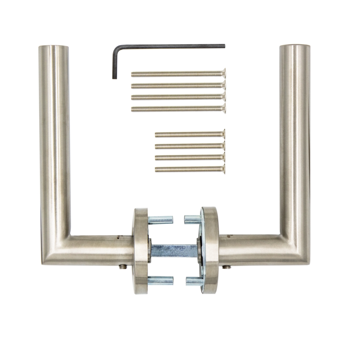 В комплекте: 2 нажимные ручки, цельный шток, декоративные накладки под цилиндр, крепежные винты для сплошных дверей