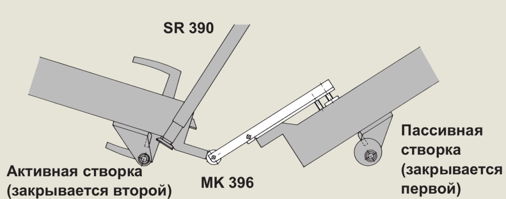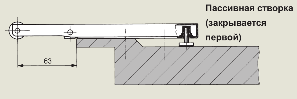 При попытке открытия двустворчатой двери за пассивную створку толкатель, монтируемый на пассивную створку, гарантированно (например, в случае оборудования дверей эвакуационных выходов устройствами “антипаника”) выведет вперед пассивной активную створку, а координатор, в свою очередь, обеспечит корректную последовательность закрывания створок.