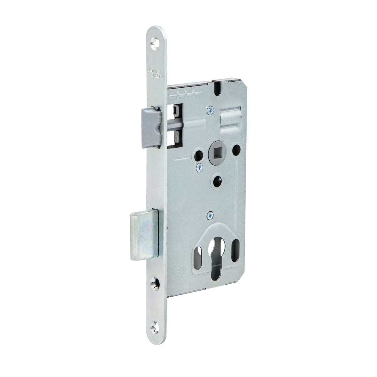 Торцевая планка замка выполнена из оцинкованной стали. Вылет стального ригеля 24 мм.