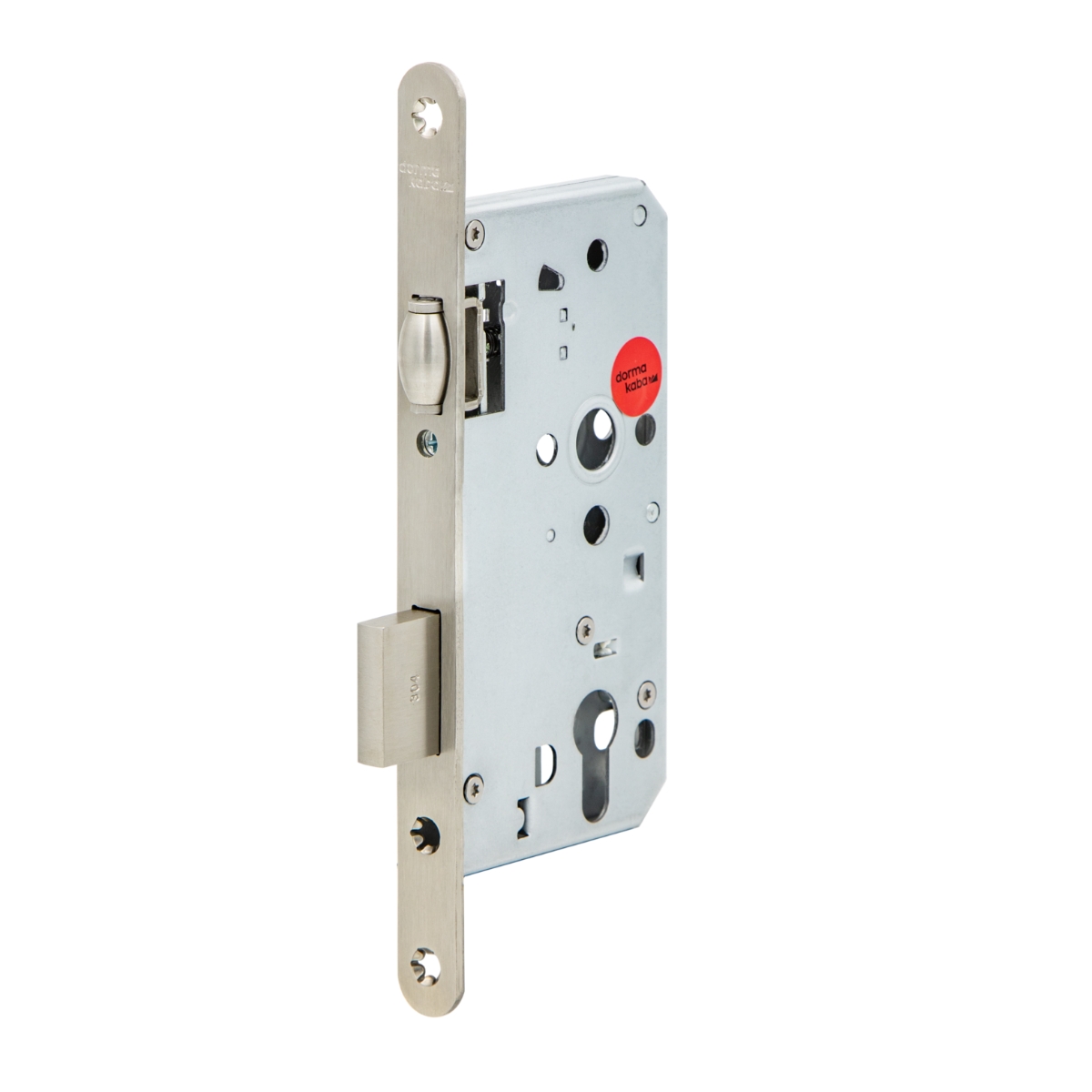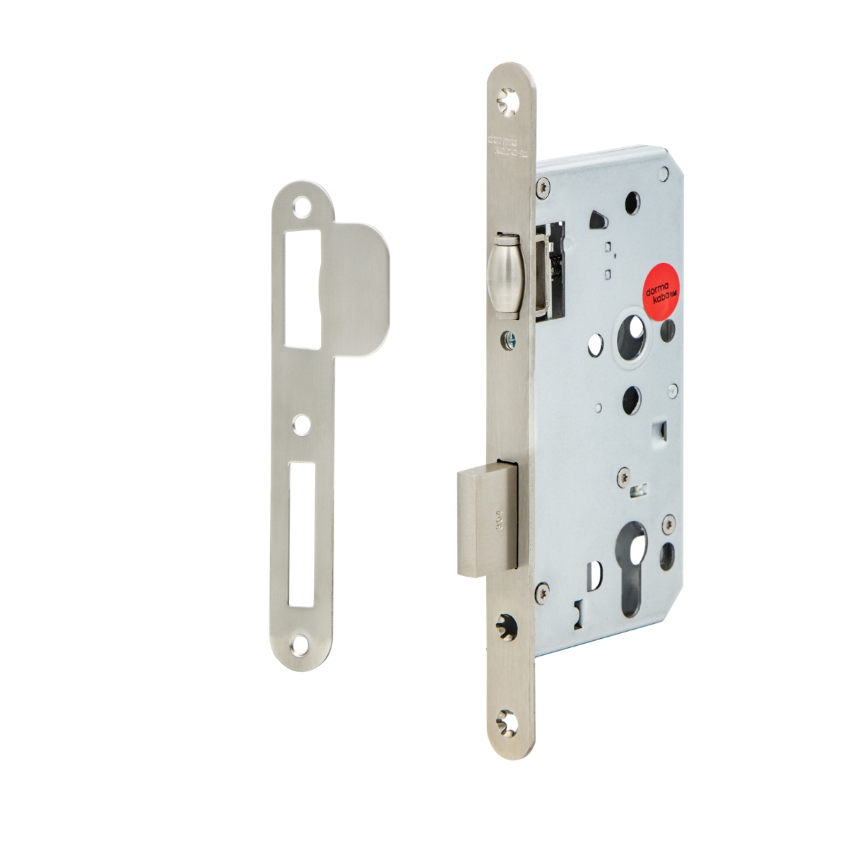 Замок для сплошных дверей с роликовой защелкой в комплекте с ответной планкой подходит для применения с ручками-штангами.