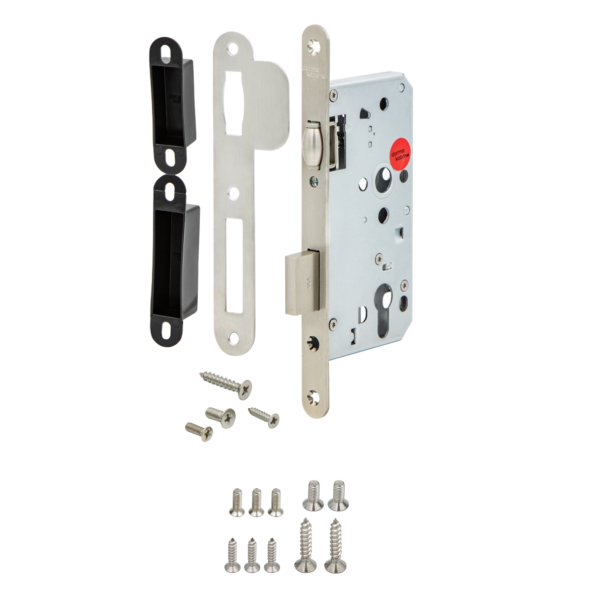 Бексет 55 мм, вылет стального ригеля 20 мм. Торцевая планка замка выполнена из нержавеющей стали марки 304.
